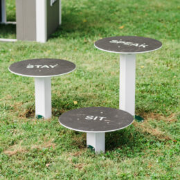 This Commercial Dop Park includes: Dog House, 3′ Crawl Tunnel, 4’x4′ Platform, Jump Thru Agility Hoop – Large, Jump Thru Agility Hoop – Small, Sit-Speak-Stay Stands, Dog Park Ramp.