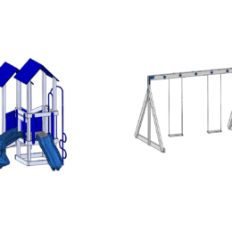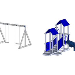 This package includes our Pioneer playground and two toddler swings. The package includes our weed guard, rubber mulch, and play zone border.