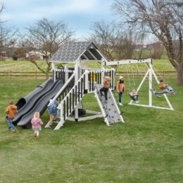The Questor Commercial Playground Equipment’s three slides make it the go-to favorite for fantastic fun in a compact playground package. Dual slides provide slide racing thrills, while the Sidewinder adds additional zip.