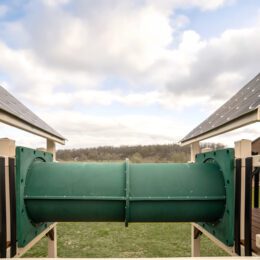 The Avalanche Slides provide zipping fun and have a safety lip at the bottom for inexperienced sliders. The rock walls, one 7′ and one 5′ tall, offer a scaling challenge while the bridge and crawl tunnels blend perfectly into whatever imaginative game the children are engaged in. The 7′ enclosed turbo tube slide adds spiralling fun to the playground.