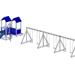 This package includes our Pioneer playground, four belt swings, and two toddler swings. The package includes our weed guard, rubber mulch, and play zone border.