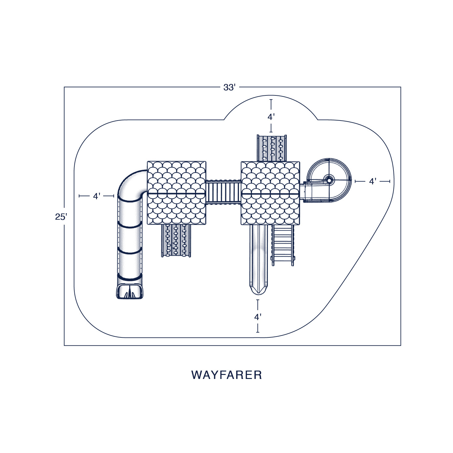 The Wayfarer’s design can be customized to fit your needs. If you have extra space, add a swing beam or additional climbers, slides, or towers. The Wayfer is a perfect match for any public site that doesn’t need to meet ASTM requirements.